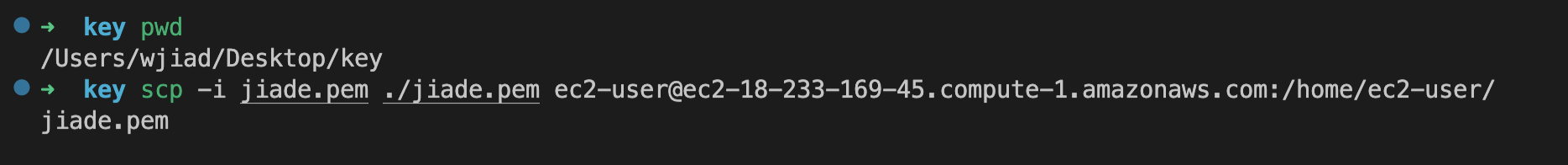 使用SCP 命令 将您的秘钥传输到堡垒机,导航至您的秘钥文件路径,键入如下命令