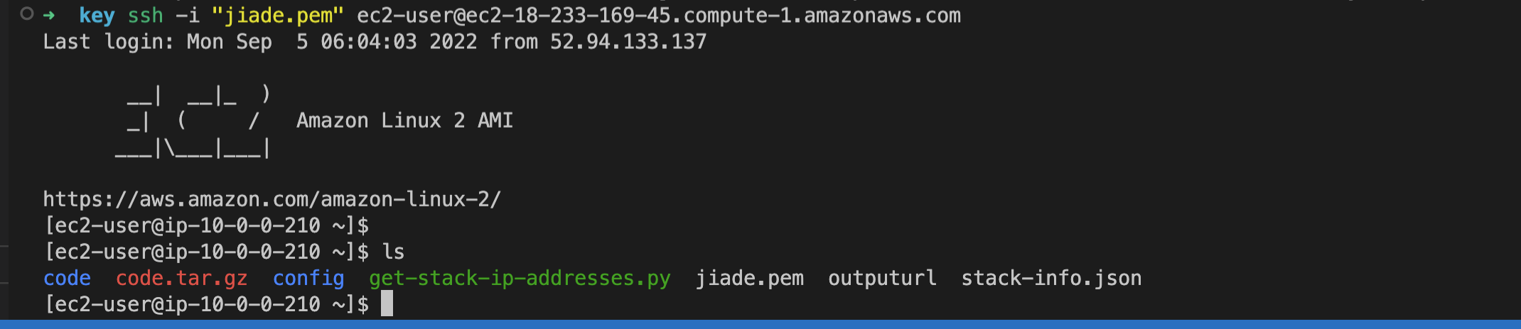 [ec2-user@ip-10-0-0-210 ~]$ ssh -i jiade.pem ec2-user@ip-10-0-0-163.ec2.internal