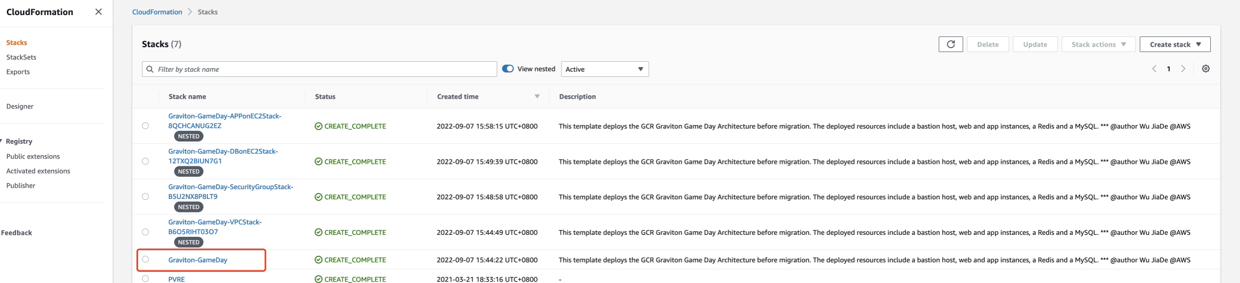 ***打开CloudFormation,点击左边的堆栈,选择图中的 Graviton-GameDay ***