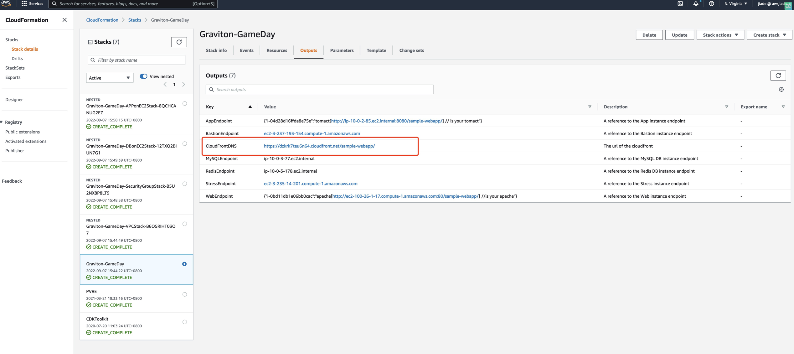 1,在您的CloudFormation主堆栈outputs中会得到多个地址输出,包含整套环境的后端访问地址。其中CloudFrontDNS是小汪公司的应用入口,这是一个Cloudfront地址,后面连接至Apache Web服务器,例如https://dirjlcj2zs8i9.cloudfront.net/sample-webapp/
