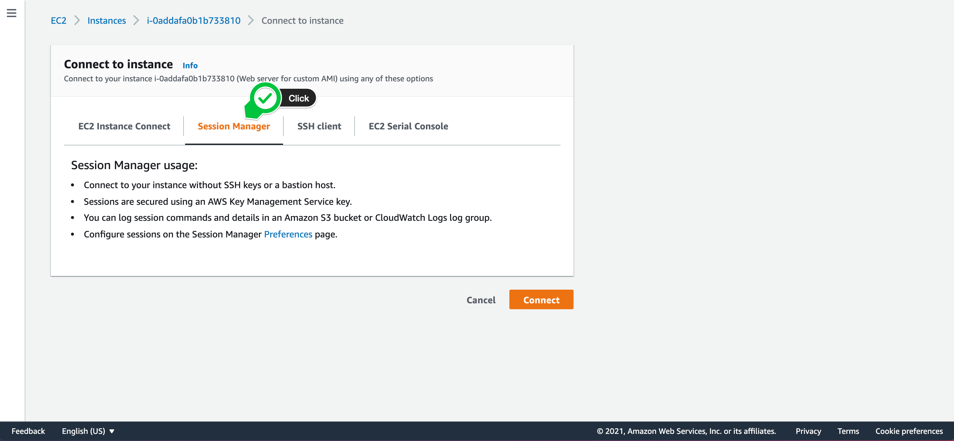 选择会话管理器session manager,点击连接,进入这台EC2的操作系统命令行界面