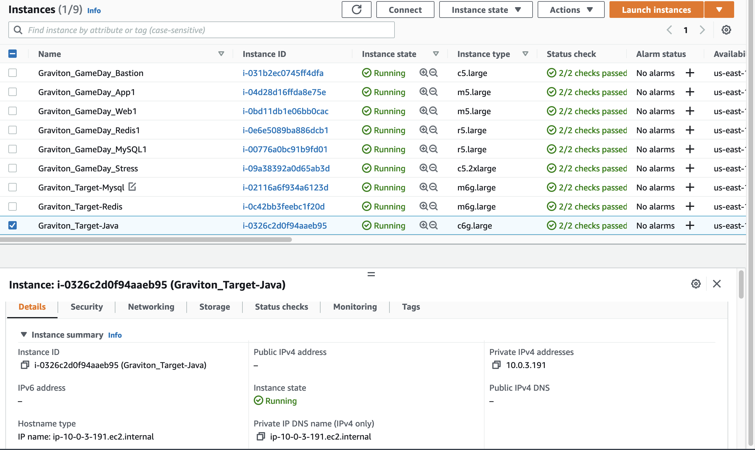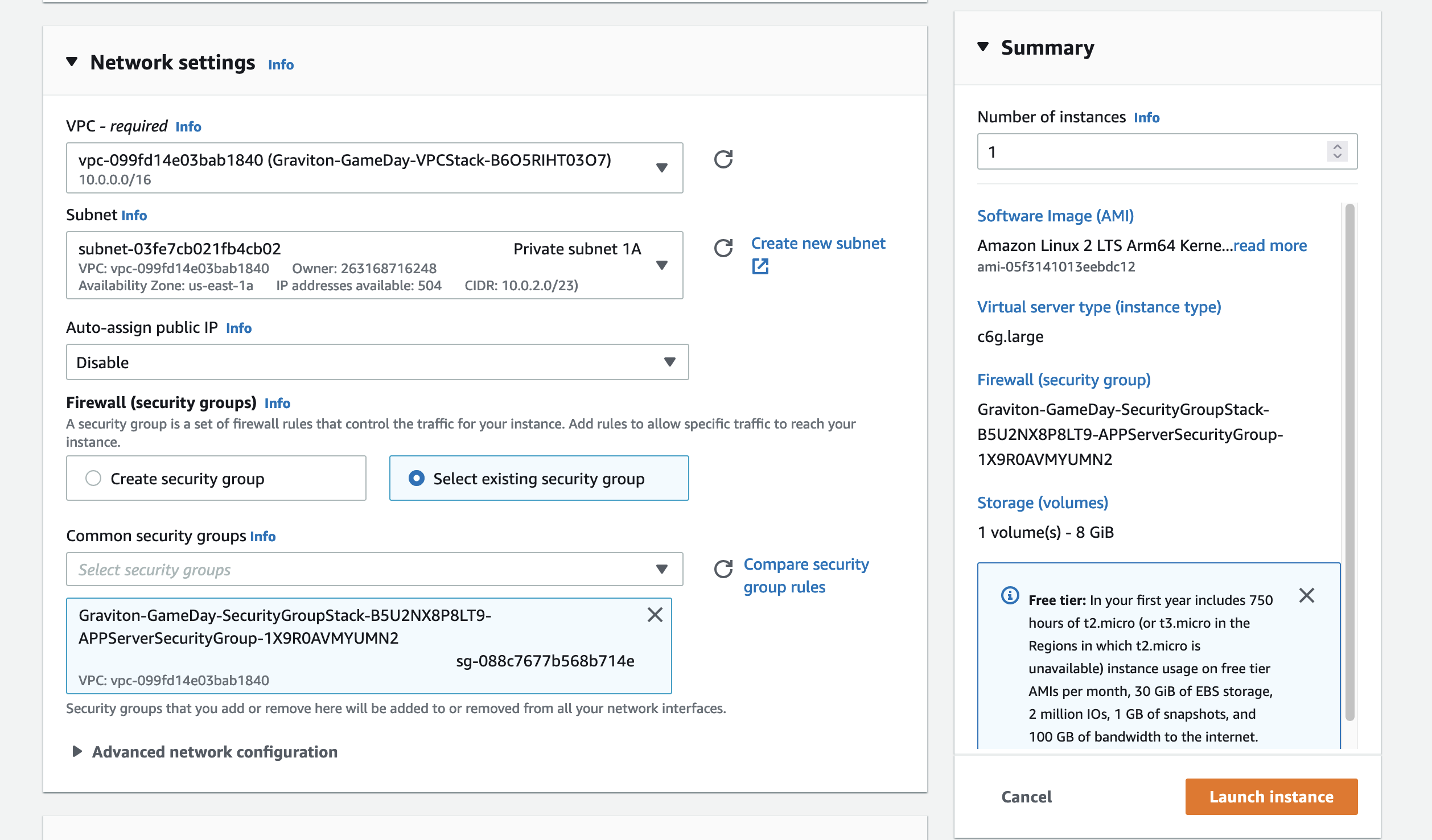 Graviton_Target-Appc6g.large Amazon Linux 2 AMI(HVM)64位(***ARM*** )ee-default-keypair.pemGraviton-GameDay-VPCStack-xxxxxxxxPrivate subnet 1AGraviton-GameDay-SecurityGroupStack-xxxxxxx-AppServerSecurityGroup1