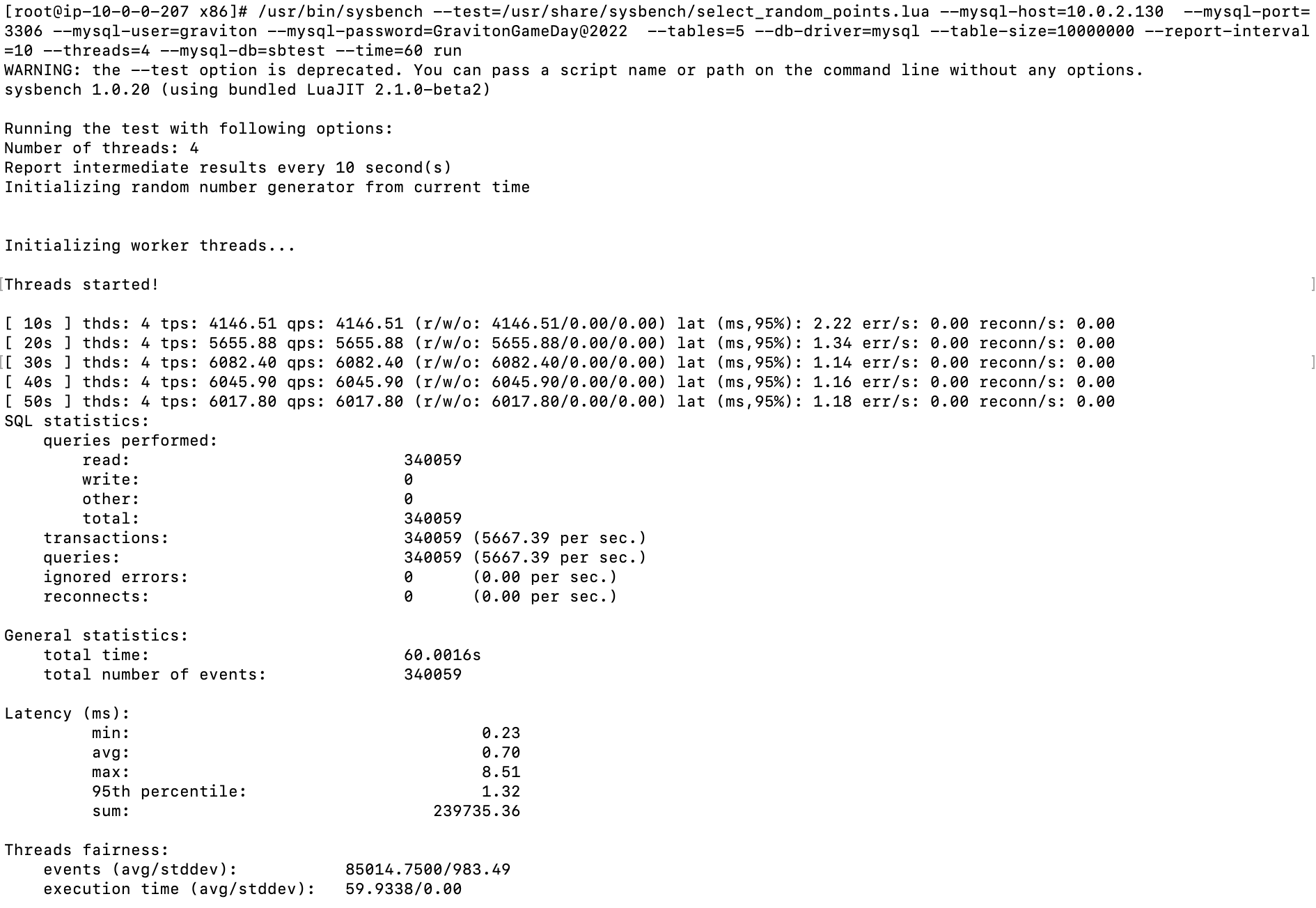 /usr/bin/sysbench --test=/usr/share/sysbench/select_random_points.lua --mysql-host=$IP --mysql-port=3306 --mysql-user=$USER --mysql-password=$PW --tables=5 --db-driver=mysql --table-size=10000000 --report-interval=10 --threads=4 --mysql-db=sbtest --time=60 run